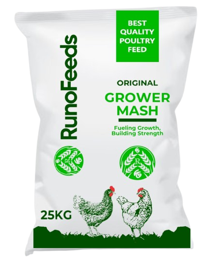 RunoFeeds Grower mash is a specially formulated poultry feed designed for pullets (young hens) after the chick stage and before they start laying eggs. It is usually fed from 9 weeks to 16 weeks of age, helping birds develop strong bones, healthy organs, and good body weight in preparation for laying.