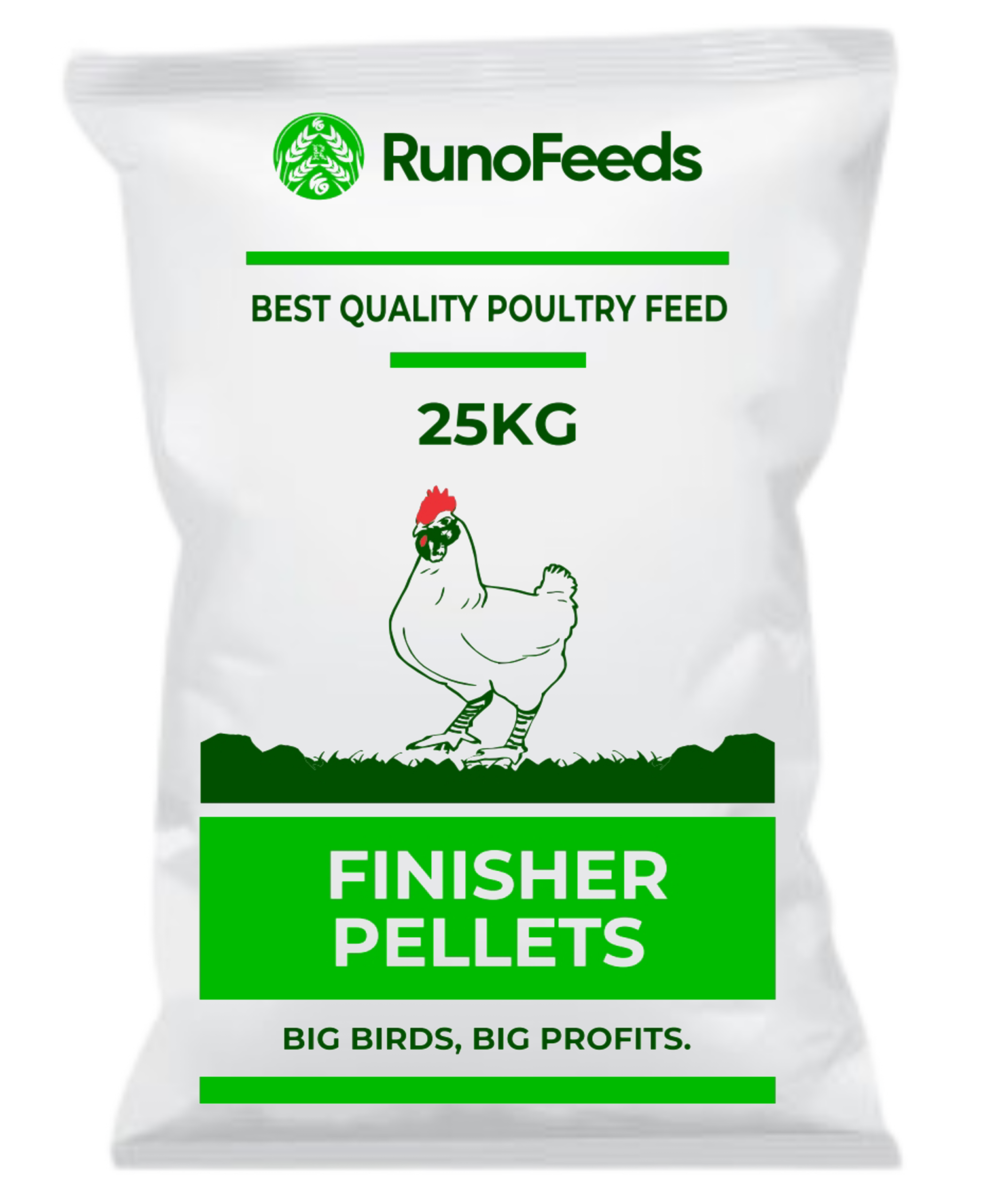 RunoFeeds Finisher pellets are specialized poultry feed designed for broiler chickens during their final growth stage, usually from 5–6 weeks of age until market weight (around 8 weeks). At this stage, the birds require a diet that promotes rapid weight gain, muscle development, and efficient feed conversion, while maintaining meat quality and health.